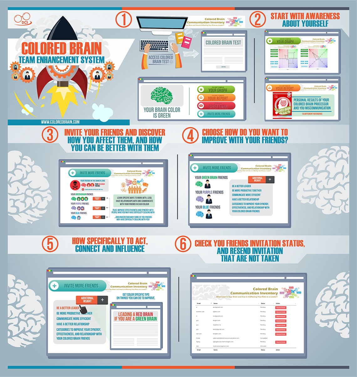 The CBCI supports More Effective Group Dynamics, Improved Relationships, and Enriched Leadership Ability… and ALL these means You Must Interact with Real People and know how to Best Manage and support them… you must know their Colored Brain and the intricacies of Working and Enhancing Relationships with them. So when you take the Colored Brain Assessment, Your Friends, Coworkers, and Partners, will be a Part of your Integrated Results Dashboard. You will be able to CLEARLY SEE how each of the people in your environment interpret you and your HOW, and you will get tips and strategies to enhance your interaction with them and their HOW.How It Works